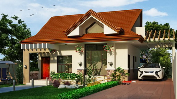บ้านหลังนี้ออกแบบมาเป็นบ้านคอนกรีตชั้นเดียวค่ะ ผนังภายนอกฉาบปูนเรียบทาสีครีม แต่งแนวเชิงผนังส่วนล่างด้วยสีน้ำตาลอ่อน หลังคาบ้านทรงหน้าจั่วมุงกระเบื้องสีน้ำตาลอมส้ม มีจั่วมุขด้านหน้าแต่งบัวปูนตามแนวเชิงชายและปั้นลม